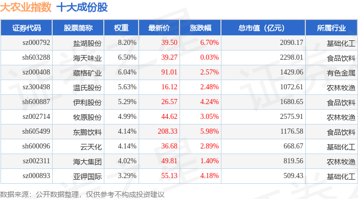 大农业(399814)指数十大成份股详情如下: