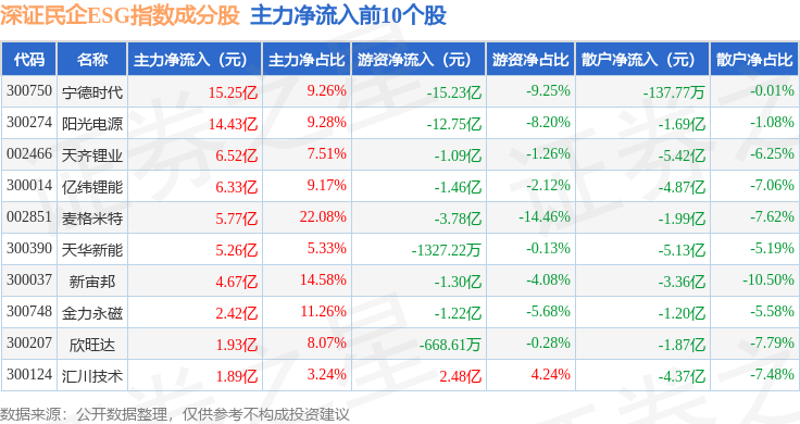 资金流向方面,深证民企ESG(970056)指数成份股当日主力资金净流入合计35.77亿元,游资资金净流出合计29.81亿元,散户资金净流出合计5.97亿元。成份股资金流向详情见下表: