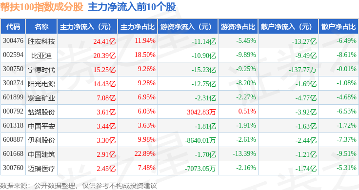 资金流向方面,帮扶100(980065)指数成份股当日主力资金净流入合计20.28亿元,游资资金净流出合计30.92亿元,散户资金净流入合计10.64亿元。成份股资金流向详情见下表: