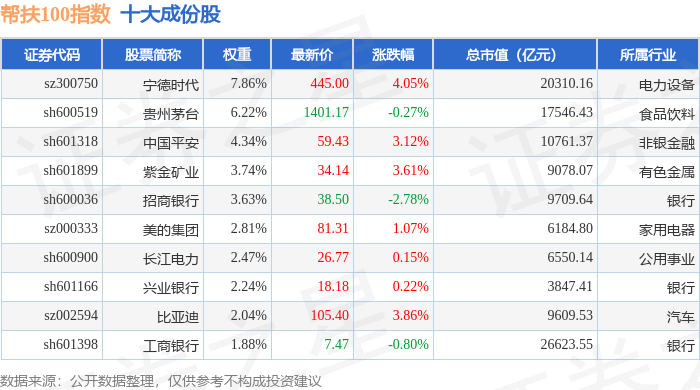 证券之星消息,4月29日,帮扶100(980065)指数报收于2124.75点,涨1.16%,成交2959.93亿元,换手率0.46%。当日该指数成份股中,上涨的有70家,汇川技术以10.15%的涨幅领涨,下跌的有27家,中国广核以3.61%的跌幅领跌。