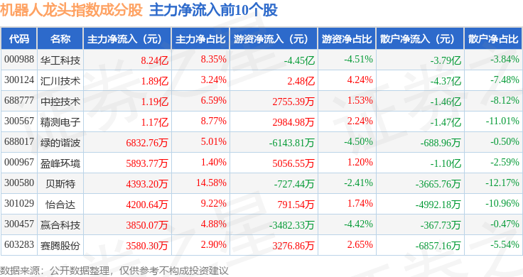 资金流向方面,机器人龙头(980071)指数成份股当日主力资金净流入合计2.5亿元,游资资金净流入合计4.64亿元,散户资金净流出合计7.14亿元。成份股资金流向详情见下表: