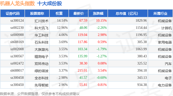 机器人龙头(980071)指数十大成份股详情如下: