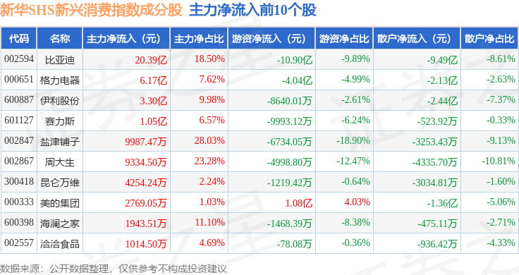 资金流向方面,新华SHS新兴消费(989006)指数成份股当日主力资金净流入合计23.22亿元,游资资金净流出合计13.79亿元,散户资金净流出合计9.43亿元。成份股资金流向详情见下表: