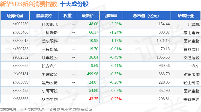 新华SHS新兴消费(989006)指数十大成份股详情如下: