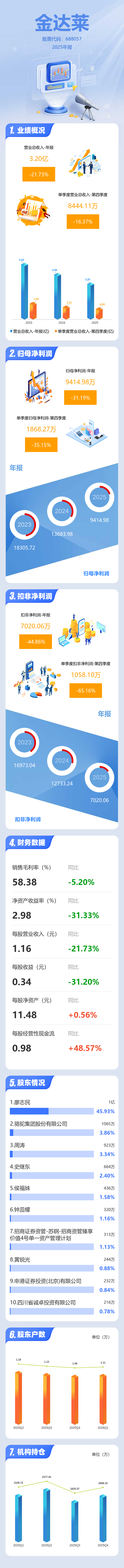 证券之星消息,金达莱2025年年报显示,当年度公司主营收入3.2亿元,同比下降21.74%;归母净利润9414.98万元,同比下降31.2%;扣非净利润7020.06万元,同比下降44.87%;其中2025年第四季度,公司单季度主营收入8444.11万元,同比下降16.37%;单季度归母净利润1868.27万元,同比下降35.16%;单季度扣非净利润1058.1万元,同比下降65.17%;负债率10.12%,投资收益1535.57万元,财务费用-4461.62万元,毛利率58.38%。