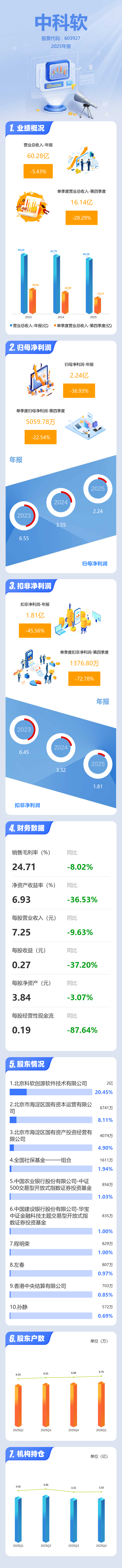 证券之星消息,中科软2025年年报显示,当年度公司主营收入60.28亿元,同比下降5.43%;归母净利润2.24亿元,同比下降36.94%;扣非净利润1.81亿元,同比下降45.56%;其中2025年第四季度,公司单季度主营收入16.14亿元,同比下降28.29%;单季度归母净利润5059.78万元,同比下降22.55%;单季度扣非净利润1376.8万元,同比下降72.79%;负债率60.07%,投资收益-1.17万元,财务费用-2575.76万元,毛利率24.71%。