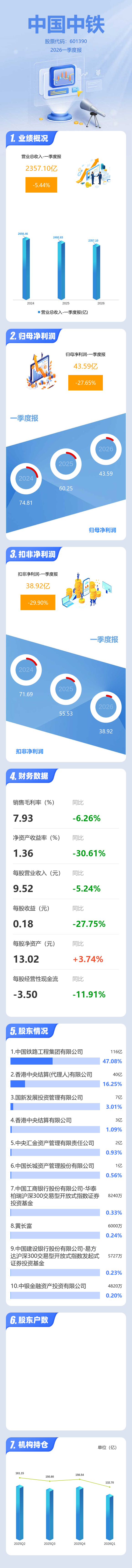 证券之星消息,中国中铁2026年一季报显示,一季度公司主营收入2357.1亿元,同比下降5.45%;归母净利润43.59亿元,同比下降27.65%;扣非净利润38.92亿元,同比下降29.91%;负债率77.46%,投资收益5.16亿元,财务费用22.23亿元,毛利率7.93%。