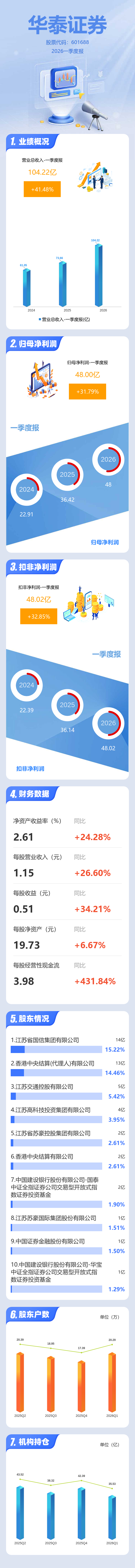 证券之星消息,华泰证券2026年一季报显示,一季度公司主营收入104.22亿元,同比上升41.48%;归母净利润48.0亿元,同比上升31.79%;扣非净利润48.02亿元,同比上升32.86%;负债率82.74%,投资收益49.38亿元。