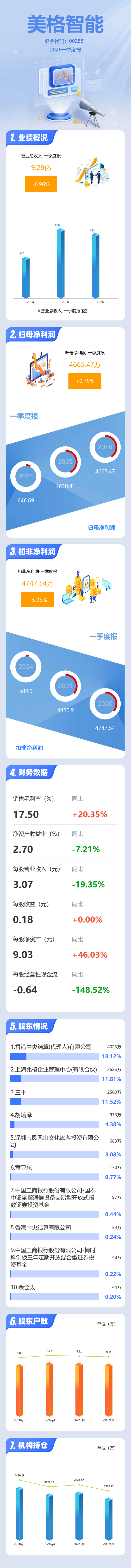 证券之星消息,美格智能2026年一季报显示,一季度公司主营收入9.28亿元,同比下降6.97%;归母净利润4665.47万元,同比上升0.76%;扣非净利润4747.54万元,同比上升5.95%;负债率38.16%,投资收益-218.65万元,财务费用344.08万元,毛利率17.5%。