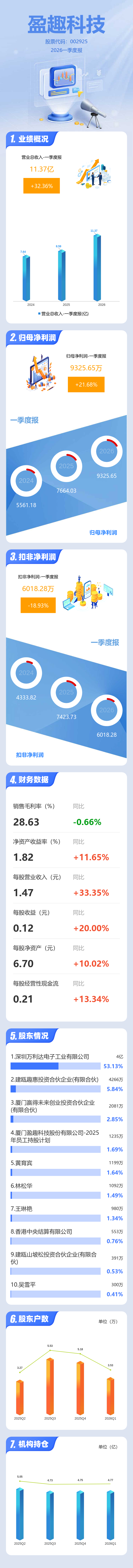 证券之星消息,盈趣科技2026年一季报显示,一季度公司主营收入11.37亿元,同比上升32.37%;归母净利润9325.65万元,同比上升21.68%;扣非净利润6018.28万元,同比下降18.93%;负债率37.22%,投资收益30.27万元,财务费用3618.68万元,毛利率28.63%。