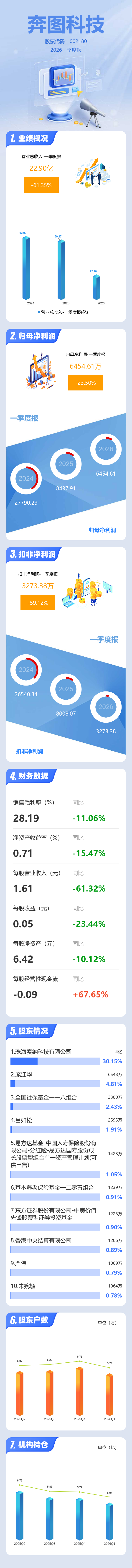 证券之星消息,奔图科技2026年一季报显示,一季度公司主营收入22.9亿元,同比下降61.36%;归母净利润6454.61万元,同比下降23.5%;扣非净利润3273.38万元,同比下降59.12%;负债率44.54%,投资收益143.82万元,财务费用3875.4万元,毛利率28.19%。