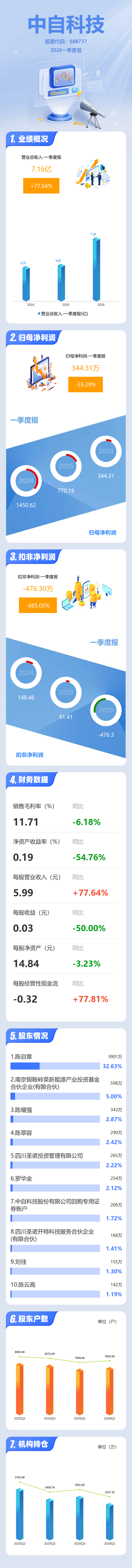 证券之星消息,中自科技2026年一季报显示,一季度公司主营收入7.16亿元,同比上升77.64%;归母净利润344.31万元,同比下降55.29%;扣非净利润-476.3万元,同比下降685.05%;负债率52.17%,投资收益-36.63万元,财务费用773.43万元,毛利率11.71%。