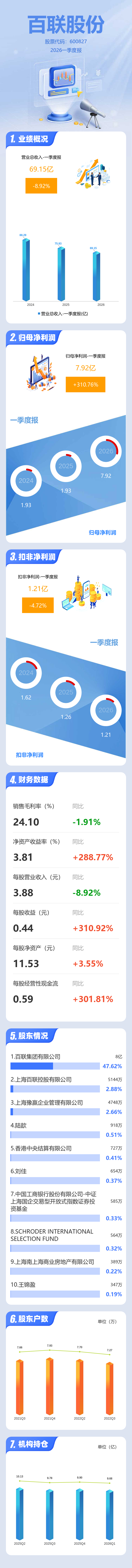证券之星消息,百联股份2026年一季报显示,一季度公司主营收入69.15亿元,同比下降8.93%;归母净利润7.92亿元,同比上升310.76%;扣非净利润1.21亿元,同比下降4.72%;负债率59.26%,投资收益6354.31万元,财务费用669.69万元,毛利率24.1%。
