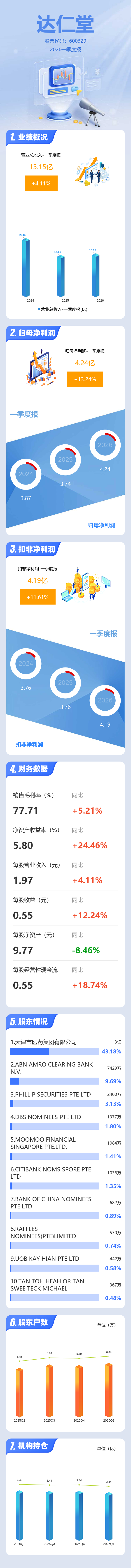 证券之星消息,达仁堂2026年一季报显示,一季度公司主营收入15.15亿元,同比上升4.12%;归母净利润4.24亿元,同比上升13.24%;扣非净利润4.19亿元,同比上升11.61%;负债率27.92%,投资收益3042.17万元,财务费用14.2万元,毛利率77.71%。
