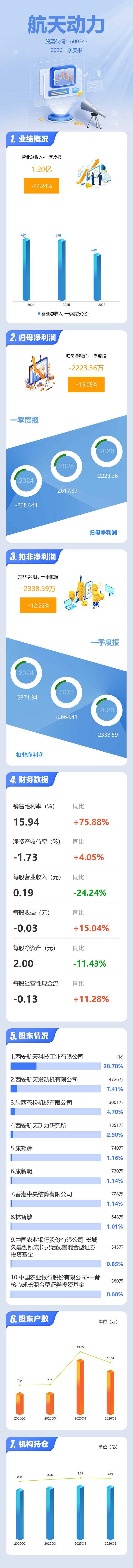 证券之星消息,航天动力2026年一季报显示,一季度公司主营收入1.2亿元,同比下降24.24%;归母净利润-2223.36万元,同比上升15.05%;扣非净利润-2338.59万元,同比上升12.23%;负债率48.9%,投资收益-42.36万元,财务费用211.02万元,毛利率15.94%。
