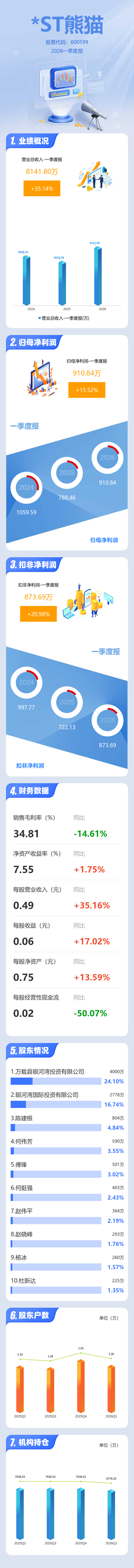 证券之星消息,*ST熊猫2026年一季报显示,一季度公司主营收入8141.8万元,同比上升35.14%;归母净利润910.84万元,同比上升15.52%;扣非净利润873.69万元,同比上升20.99%;负债率71.54%,投资收益0.68万元,财务费用385.93万元,毛利率34.81%。