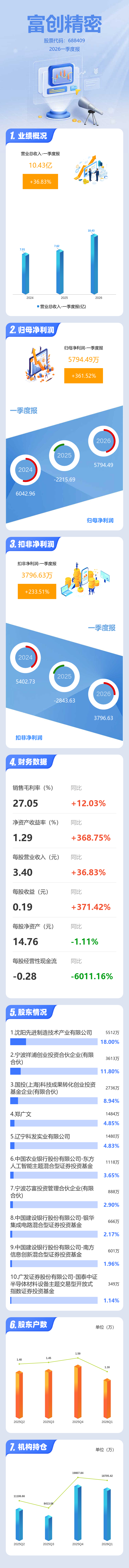 证券之星消息,富创精密2026年一季报显示,一季度公司主营收入10.43亿元,同比上升36.84%;归母净利润5794.49万元,同比上升361.52%;扣非净利润3796.63万元,同比上升233.51%;负债率48.87%,投资收益541.22万元,财务费用2404.26万元,毛利率27.05%。