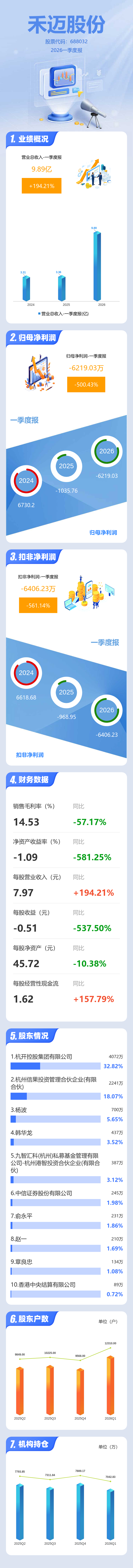 证券之星消息,禾迈股份2026年一季报显示,一季度公司主营收入9.89亿元,同比上升194.22%;归母净利润-6219.03万元,同比下降500.43%;扣非净利润-6406.23万元,同比下降561.15%;负债率36.07%,投资收益194.87万元,财务费用1598.24万元,毛利率14.53%。