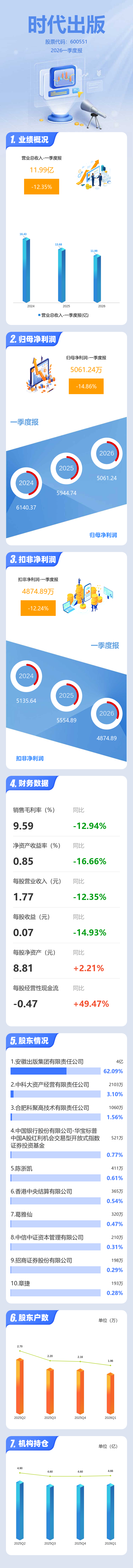 证券之星消息,时代出版2026年一季报显示,一季度公司主营收入11.99亿元,同比下降12.35%;归母净利润5061.24万元,同比下降14.86%;扣非净利润4874.89万元,同比下降12.24%;负债率29.31%,投资收益1192.42万元,财务费用-341.62万元,毛利率9.59%。