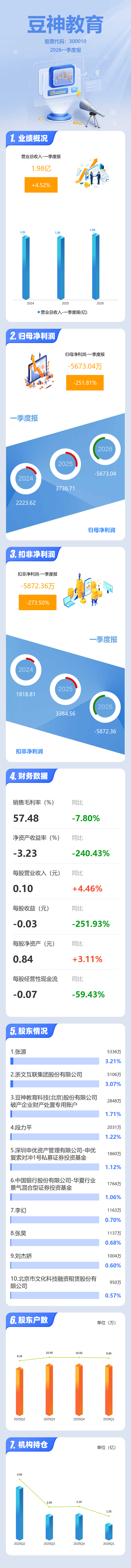 证券之星消息,豆神教育2026年一季报显示,一季度公司主营收入1.98亿元,同比上升4.52%;归母净利润-5673.04万元,同比下降251.82%;扣非净利润-5872.36万元,同比下降273.5%;负债率30.13%,投资收益8.87万元,财务费用-252.48万元,毛利率57.48%。