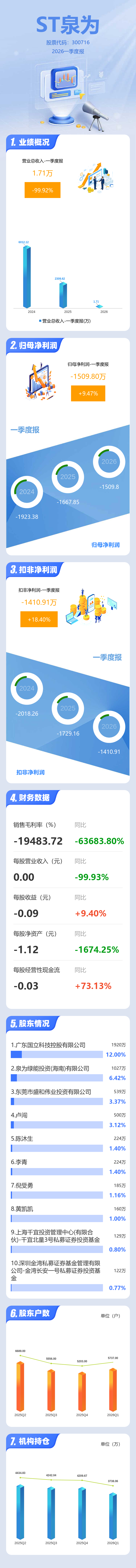 证券之星消息,ST泉为2026年一季报显示,一季度公司主营收入1.71万元,同比下降99.93%;归母净利润-1509.8万元,同比上升9.48%;扣非净利润-1410.91万元,同比上升18.41%;负债率156.45%,财务费用908.91万元,毛利率-19483.72%。
