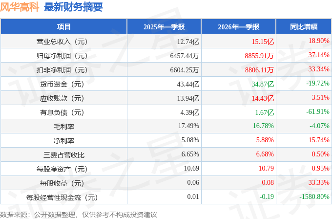 据证券之星公开数据整理,近期风华高科(000636)发布2026年一季报。截至本报告期末,公司营业总收入15.15亿元,同比上升18.9%,归母净利润8855.91万元,同比上升37.14%。按单季度数据看,第一季度营业总收入15.15亿元,同比上升18.9%,第一季度归母净利润8855.91万元,同比上升37.14%。本报告期风华高科公司应收账款体量较大,当期应收账款占最新年报归母净利润比达509.22%。
