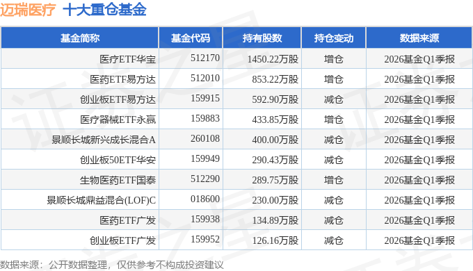 持有迈瑞医疗最多的基金为医疗ETF华宝,目前规模为279.96亿元,最新净值0.3384(4月29日),较上一交易日下跌0.06%,近一年上涨8.6%。该基金现任基金经理为张放。