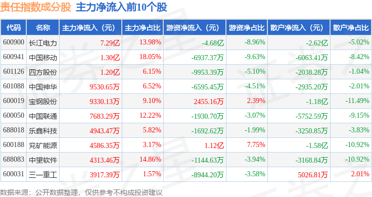 资金流向方面,责任指数(000048)成份股当日主力资金净流出合计40.02亿元,游资资金净流入合计8.1亿元,散户资金净流入合计31.92亿元。成份股资金流向详情见下表: