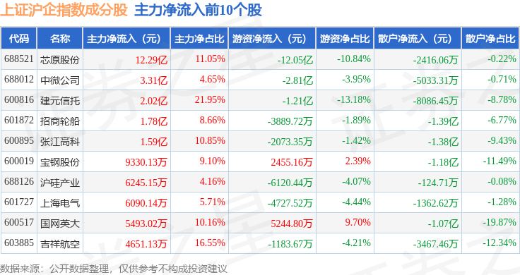 资金流向方面,上证沪企(000062)指数成份股当日主力资金净流出合计3.62亿元,游资资金净流出合计3.3亿元,散户资金净流入合计6.92亿元。成份股资金流向详情见下表:
