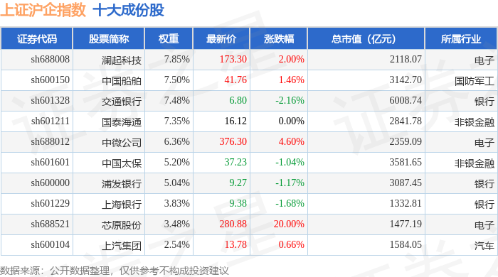 上证沪企(000062)指数十大成份股详情如下: