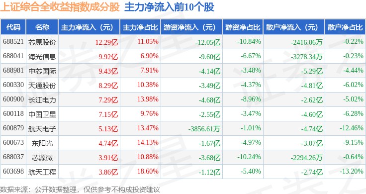 资金流向方面,上证综合全收益(000888)指数成份股当日主力资金净流出合计281.66亿元,游资资金净流入合计42.21亿元,散户资金净流入合计239.45亿元。成份股资金流向详情见下表: