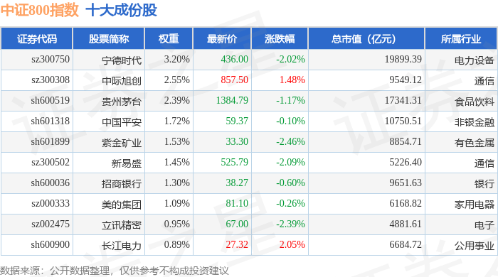 中证800(000906)指数十大成份股详情如下: