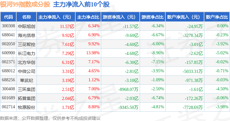 资金流向方面,银河99(000959)指数成份股当日主力资金净流出合计150.31亿元,游资资金净流入合计37.57亿元,散户资金净流入合计112.74亿元。成份股资金流向详情见下表:
