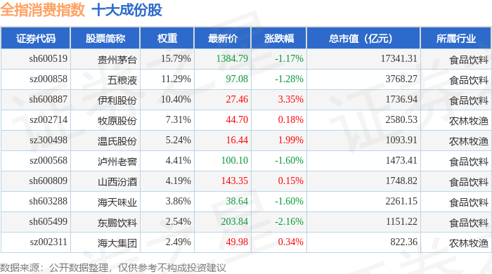 全指消费(000990)指数十大成份股详情如下: