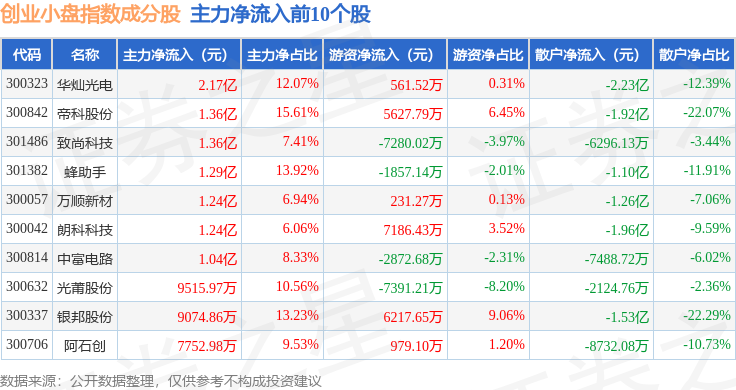 资金流向方面,创业小盘(399020)指数成份股当日主力资金净流出合计16.83亿元,游资资金净流入合计1.55亿元,散户资金净流入合计15.28亿元。成份股资金流向详情见下表: