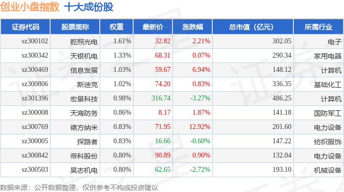 创业小盘(399020)指数十大成份股详情如下: