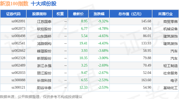 证券之星消息,4月30日,新浪100(399297)指数报收于6285.44点,跌0.76%,成交190.64亿元,换手率2.03%。当日该指数成份股中,上涨的有26家,姚记科技以5.08%的涨幅领涨,下跌的有71家,江苏国泰以9.32%的跌幅领跌。