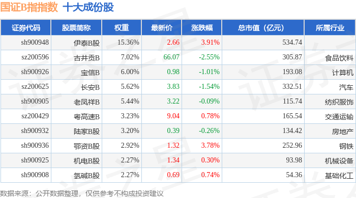 证券之星消息,4月30日,国证B指(399318)指数报收于5239.5点,涨0.4%,成交3.31亿元,换手率0.27%。当日该指数成份股中,上涨的有29家,安道麦B以9.88%的涨幅领涨,下跌的有39家,*ST康佳B以4.94%的跌幅领跌。
