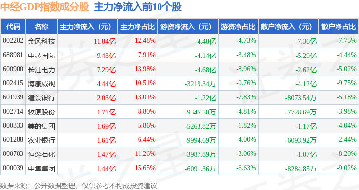 资金流向方面,中经GDP(399399)指数成份股当日主力资金净流出合计188.71亿元,游资资金净流入合计65.55亿元,散户资金净流入合计123.16亿元。成份股资金流向详情见下表:
