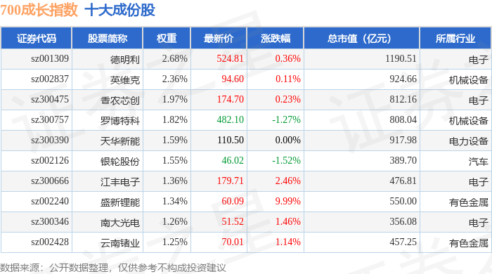 证券之星消息,4月30日,700成长(399628)指数报收于2747.99点,涨0.32%,成交1649.84亿元,换手率3.19%。当日该指数成份股中,上涨的有102家,英杰电气以12.88%的涨幅领涨,下跌的有129家,索菲亚以6.47%的跌幅领跌。