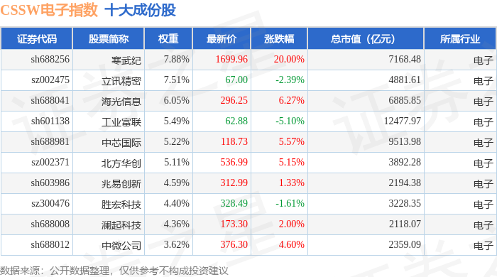 证券之星消息,4月30日,CSSW电子(399811)指数报收于6899.5点,涨2.72%,成交2663.58亿元,换手率3.09%。当日该指数成份股中,上涨的有35家,寒武纪以20.0%的涨幅领涨,下跌的有24家,联创光电以6.8%的跌幅领跌。