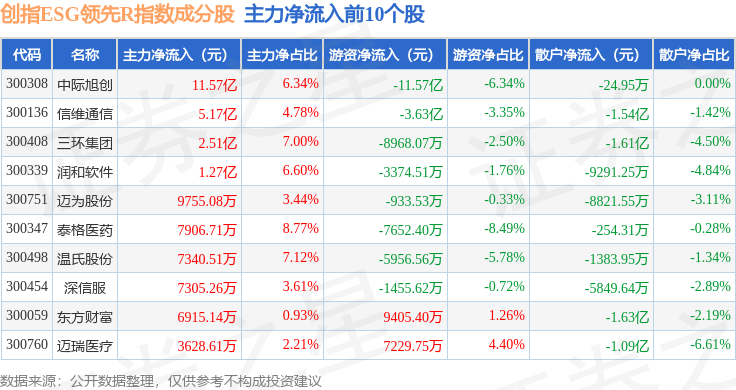 资金流向方面,创指ESG领先R(470031)指数成份股当日主力资金净流出合计18.2亿元,游资资金净流入合计1.87亿元,散户资金净流入合计16.33亿元。成份股资金流向详情见下表: