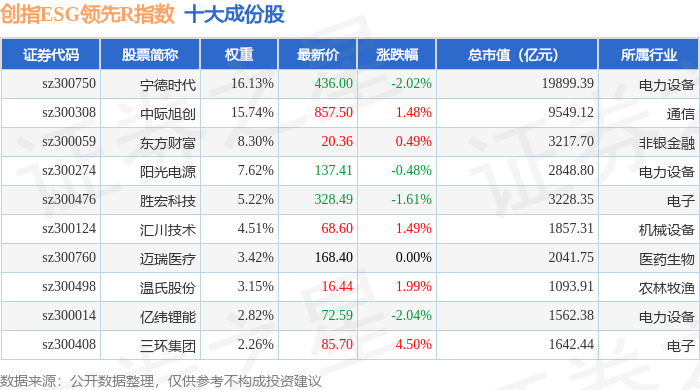 创指ESG领先R(470031)指数十大成份股详情如下: