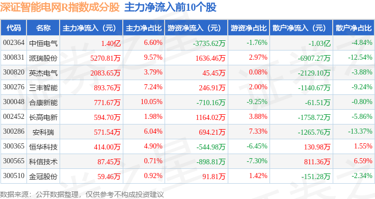 资金流向方面,深证智能电网R(470054)指数成份股当日主力资金净流出合计23.22亿元,游资资金净流入合计3.64亿元,散户资金净流入合计19.58亿元。成份股资金流向详情见下表: