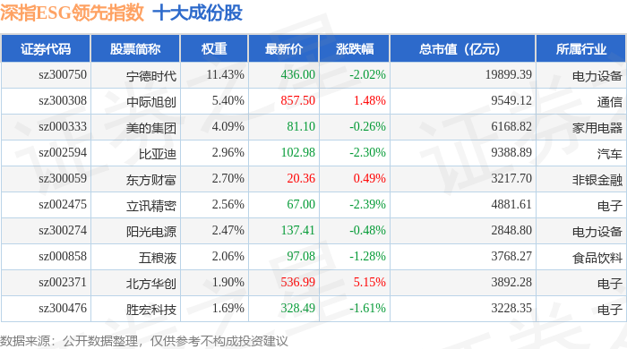 深指ESG领先(970029)指数十大成份股详情如下: