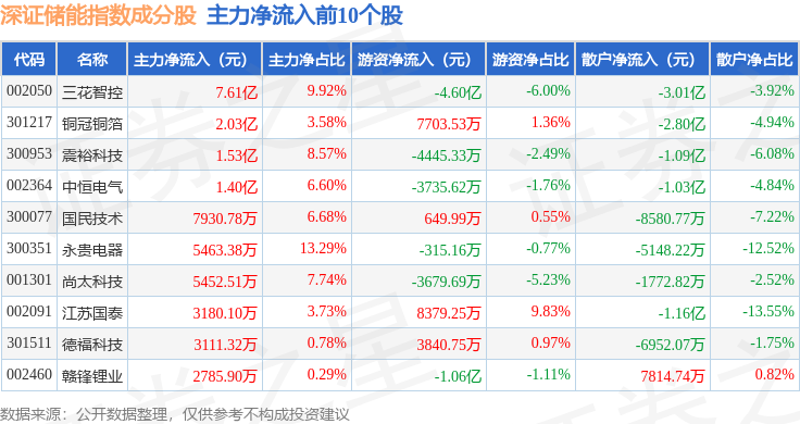 资金流向方面,深证储能(970036)指数成份股当日主力资金净流出合计58.08亿元,游资资金净流入合计14.14亿元,散户资金净流入合计43.95亿元。成份股资金流向详情见下表: