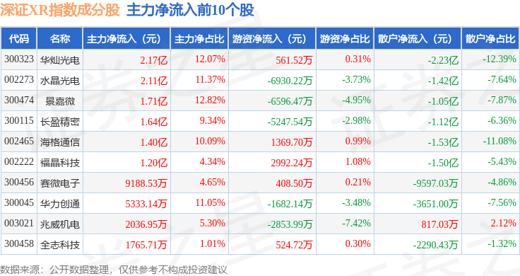 资金流向方面,深证XR(970046)指数成份股当日主力资金净流出合计19.63亿元,游资资金净流入合计3.34亿元,散户资金净流入合计16.29亿元。成份股资金流向详情见下表: