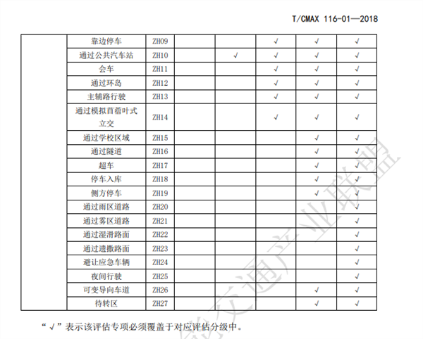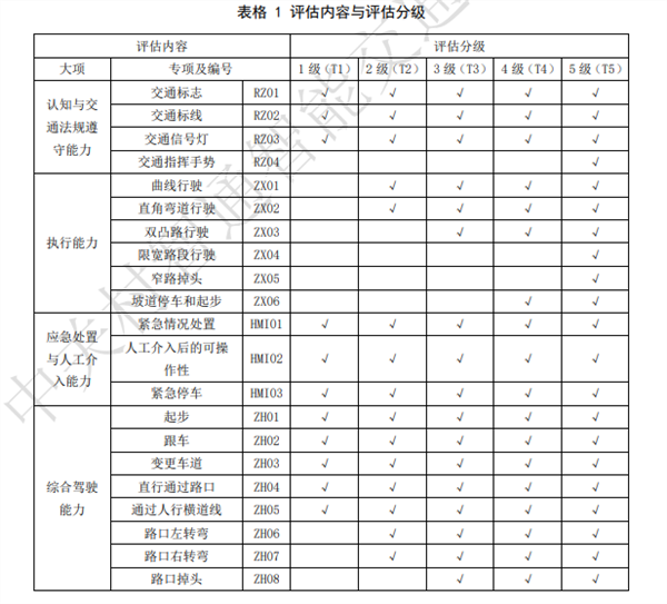 根据测试的内容要求,高速道路与快速路评估车辆速度限制在 100km/h 以下,其他道路评估车辆速度限制在 60km/h 以下。评估内容包括车辆的认知与交通法规遵守能力、执行能力、应急处置与人工介入能力、综合驾驶能力等等。