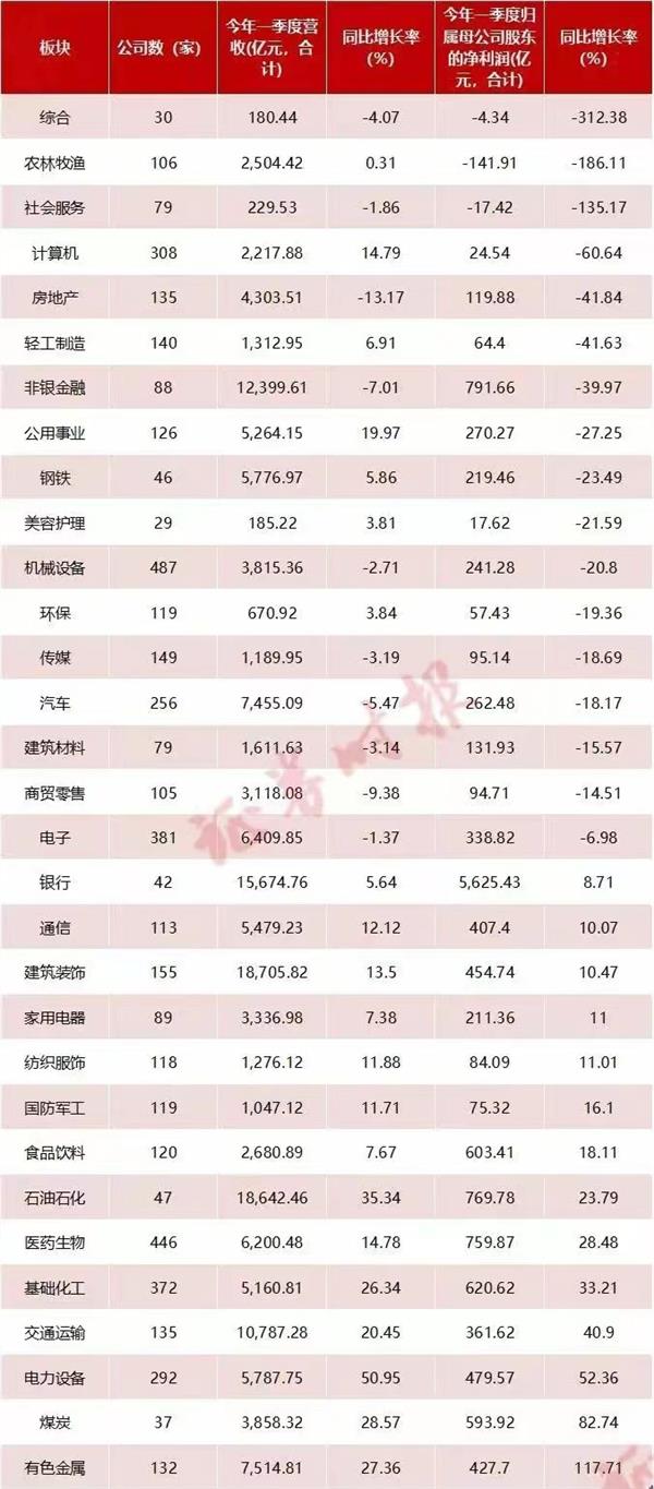 有色金属、煤炭、电力设备、交通运输等行业则延续了强势表现,今年一季度净利润同比增幅均超过40%。