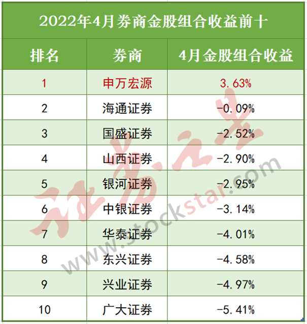 值得一提的是,各大的券商的金股组合几乎是“全军覆没”,仅有申万宏源一家实现了正收益,4月金股收益率为3.63%。此外,收益率排名前十的其他各家金股都是负收益。可以说,今年以来各券商金股组合之间比拼的不是哪家盈利多,而是哪家亏得少。